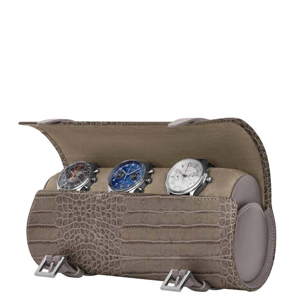 4 手表圆柱形收纳盒 - Light Taupe - Crocodile Style Calfskin 浅灰褐色  - 鳄鱼皮风格小牛皮