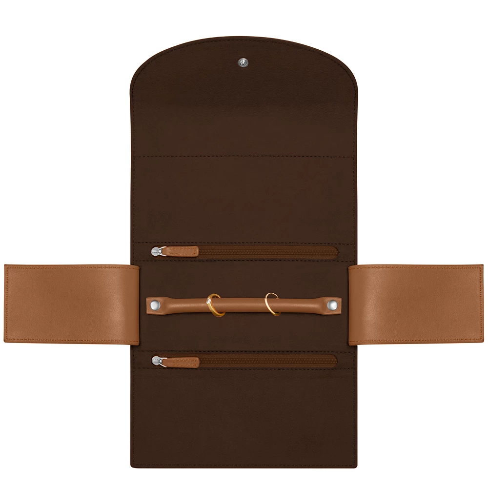 这款精美的首饰护套,天然皮革质地,有两个拉链内袋,可收纳手环、项链及任何其他珍宝!中间为做工精细的皮条,便于收纳戒指,设计巧妙。皮条两端采用按扣设计,确保安全收纳戒指。无论在家还是出行,这款真皮首饰护套,做工精美,携带便捷,安全可靠,可收纳珍贵饰物。