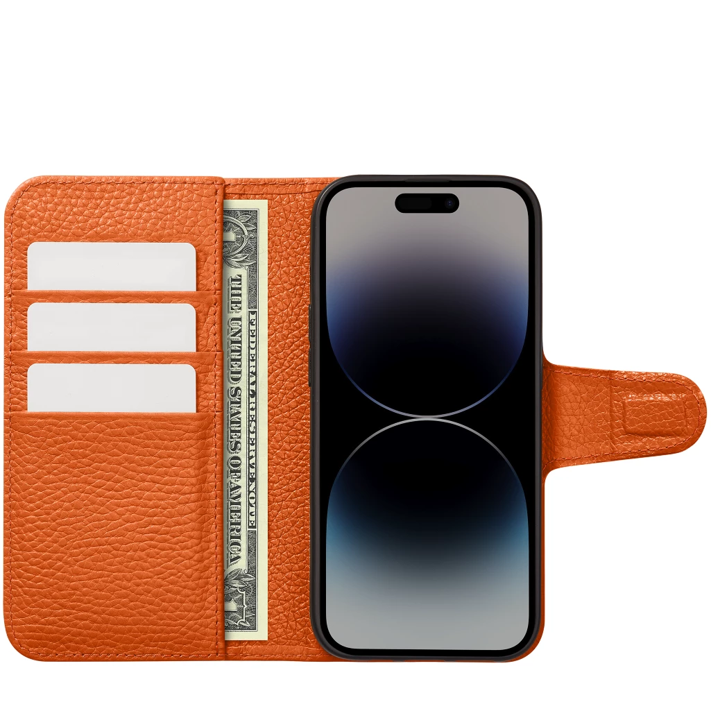 手機錢包護套配備卡槽,用於收納信用卡和現金,但依舊纖薄。全能一體設計,日常方便攜帶。